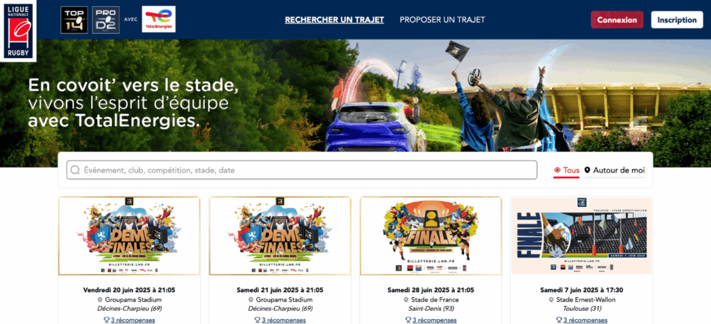 The official carpooling platform for the 2023 Rugby World Cup, powered by TotalEnergies,